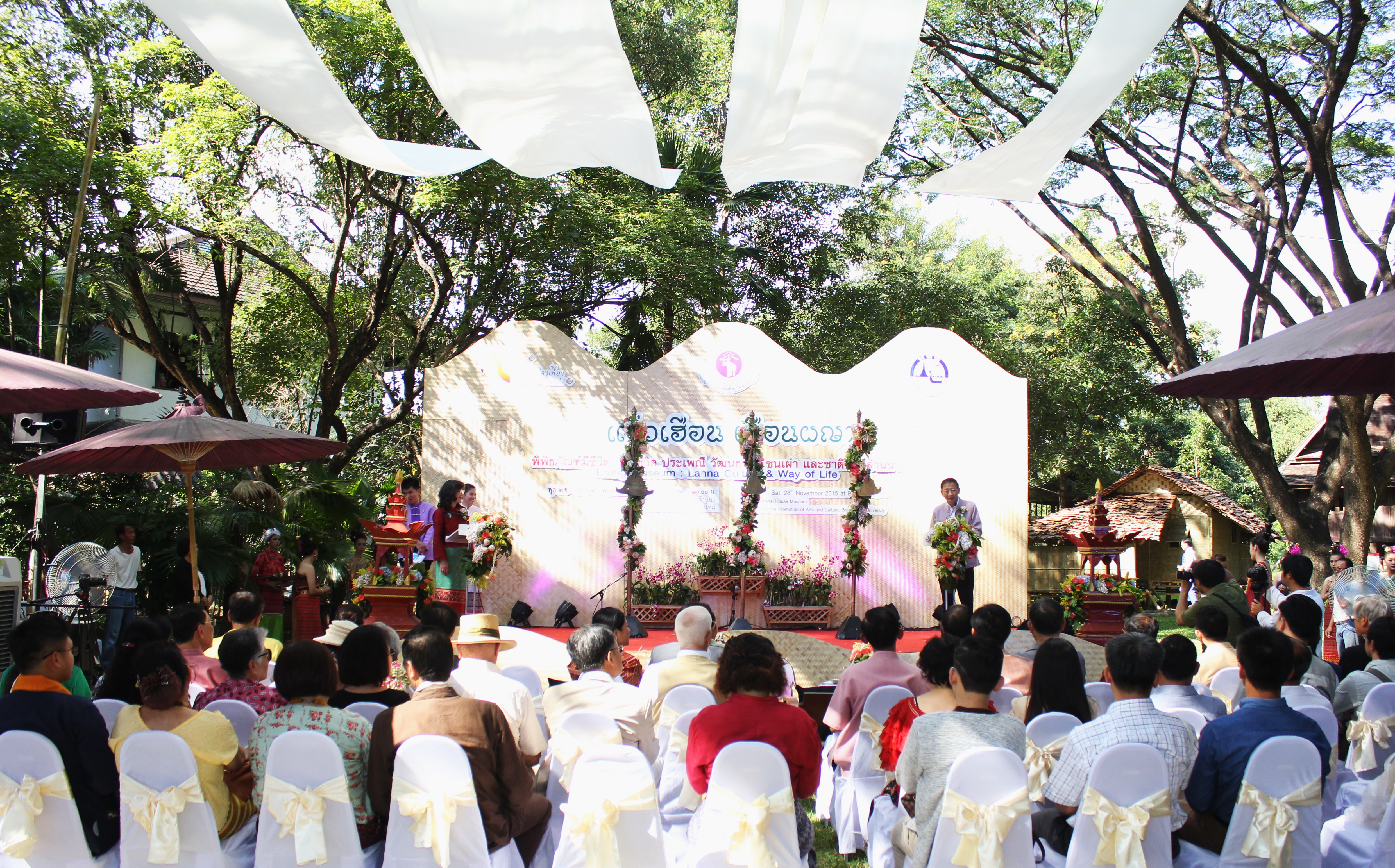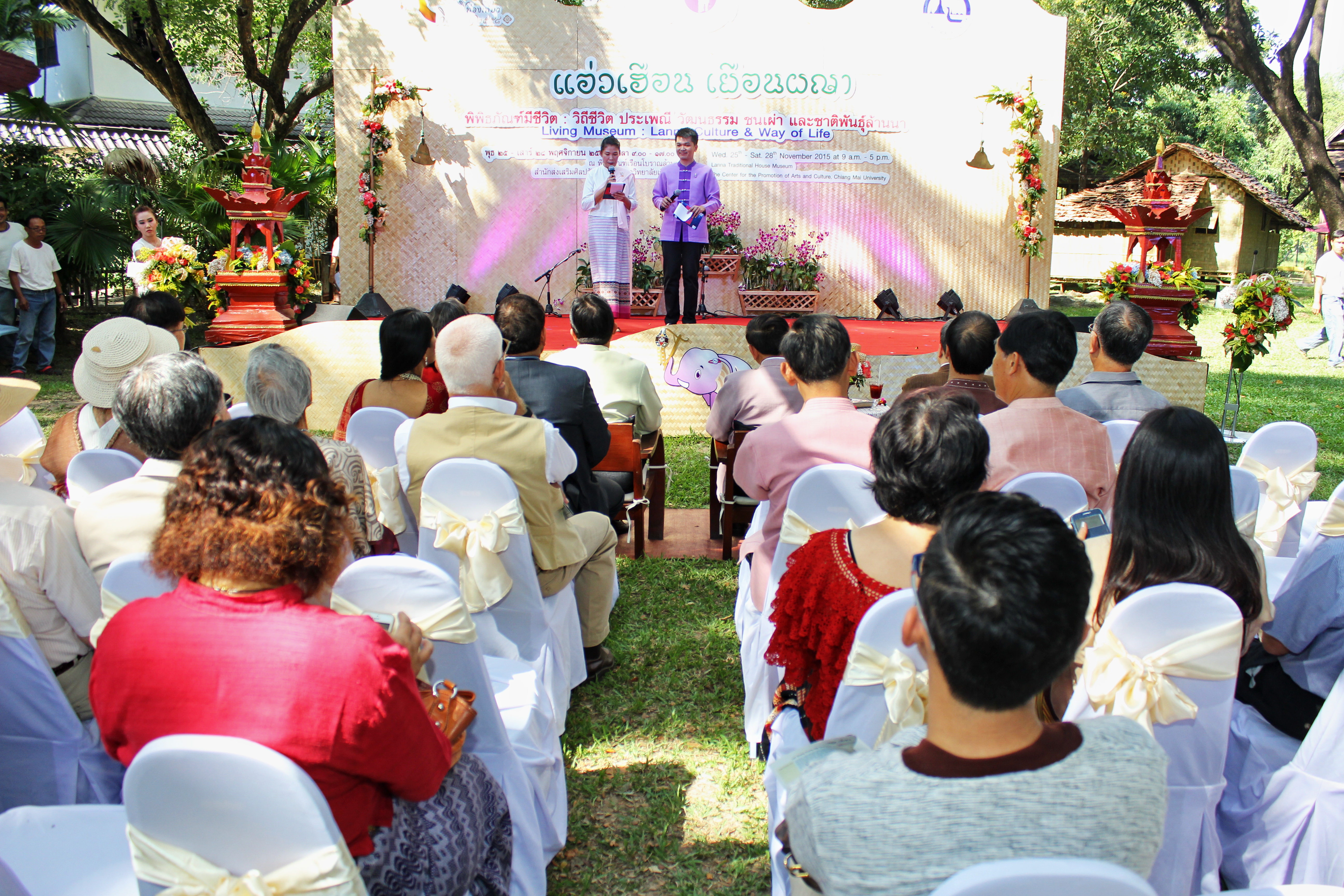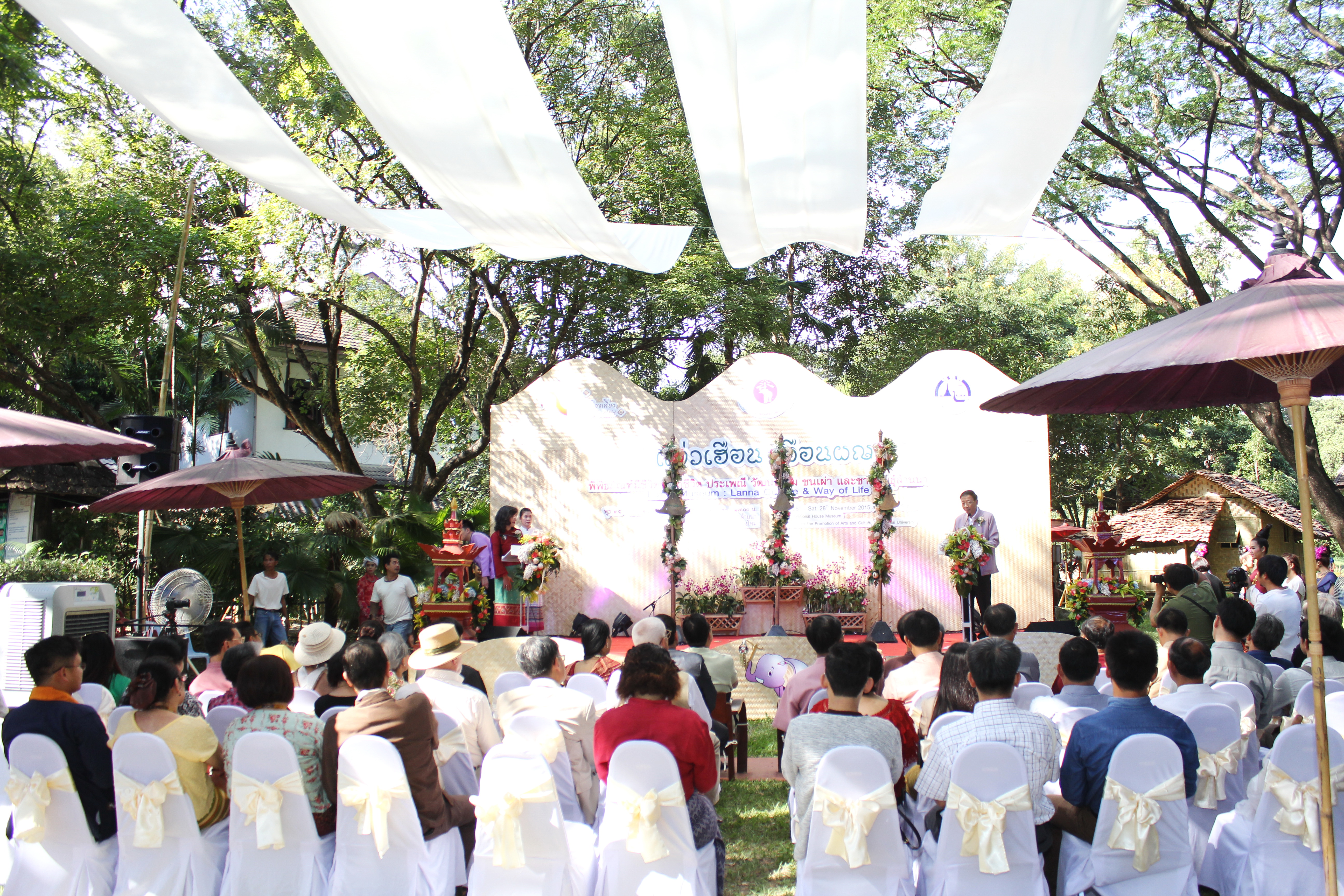 เมื่ิอวันที่ 25 พฤศจิกายน 2558 สำนักส่งเสริมศิลปวัฒนธรรม มช. จัดพิธีเปิดงาน แอ่วเฮือน เยือนผญา พิพิธภัณฑ์มีชีวิต วิถีชีวิต ประเพณี วัฒนธรรม ชนเผ่า และชาติพันธุ์ล้านนา โดยมี นายนายกฤษณ์ ธนาวณิช รองผู้ว่าราชการจังหวัดเชียงใหม่ ผศ.นพ.ศุภชัย เชื้อรัตนพงษ์ รองอธิการบดีฝ่ายบริการสภามหาวิทยาลัย มช. นายวิสูตร บัวชุม ผู้อำนวยการการท่องเที่ยวแห่งประเทศไทย (ททท.) สำนักงานเชียงใหม่ และผศ.วิลาวัณย์ เศวตเศรนี ผู้อำนวยการสำนักส่งเสริมศิลปวัฒนธรรม มช.ร่วมเปิดงาน ‘แอ่วเฮือน เยือนผญา’ พิพิธภัณฑ์มีชีวิต : วิถีชีวิต ประเพณี วัฒนธรรม ชนเผ่า และชาติพันธุ์ล้านนา พร้อมด้วยกงสุลกิตติมศักดิ์จากประเทศต่างๆ และแขกผู้มีเกียรติเข้าร่วมพิธีเปิดดังกล่าว โดยมีรูปแบบการจัดแสดงวิถีชีวิต ประเพณี วัฒนธรรม ชนเผ่า และชาติพันธุ์ล้านนา และสาธิตกิจกรรมการเรียนรู้ 8 ด้านล้านนา โครงการล้านนาคดีศึกษา มหาวิทยาลัยเชียงใหม่ การฝึกประดิษฐ์และสาธิตการละเล่น “ม่วนงันของเล่น 4 ภาค” ข่วงสุขภาพ การสาธิตนวดแผนไทย (นวดสวนดอก) การฝึกประดิษฐ์และสาธิต การผลิตงานหัตถกรรมพื้นบ้าน “ลานสรวงข่วงศิลป์” จากพ่อครู แม่ครู และสล่าเมือง กาดหมั้ว และการแสดงด้านศิลปวัฒนธรรมต่างๆในรอบบริเวณพิพิธภัณฑ์เรือนโบราณล้านนา ทั้งนี้เพื่อเป็นการประชาสัมพันธ์การจัดงานดังกล่าวให้เป็นไปอย่างทั่วถึงทุกกลุ่มเป้าหมาย และอีกทั้งเป็นการส่งเสริมการท่องเที่ยวภายในจังหวัดเชียงใหม่ในช่วงฤดูกาลท่องเที่ยวประเพณียี่เป็ง โดยงานแอ่วเฮือน เยือนผญา พิพิธภัณฑ์มีชีวิต วิถีชีวิต ประเพณี วัฒนธรรม ชนเผ่า และชาติพันธุ์ล้านนา จัดขึ้นตั้งแต่วันที่ 25-28พฤศจิกายน 2558 เวลา 09.00- 17.00 น. ณ พิพิธภัณฑ์เรือนโบราณล้านนา สำนักส่งเสริมศิลปวัฒนธรรม มช.