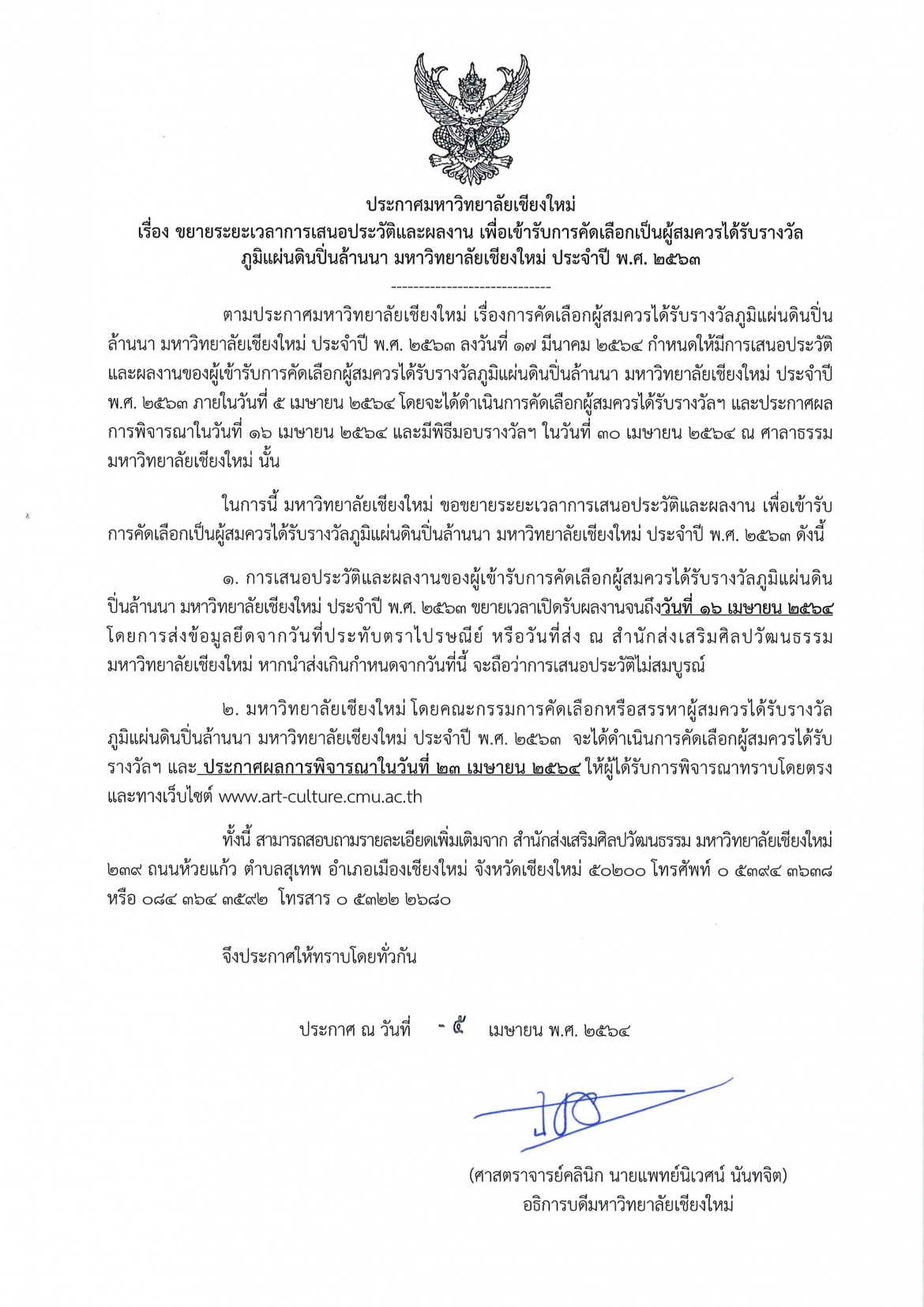 ประกาศขยายระยะเวลาการเสนอประวัติและผลงาน เพื่อเข้ารับการคัดเลือกเป็นผู้สมควรได้รับรางวัลภูมิแผ่นดิน ปิ่นล้านนา มหาวิทยาลัยเชียงใหม่ ประจำปี พ.ศ. 2563 จนถึงวันที่ 16 เมษายน 2564 ตามรายละเอียดในเอกสารที่แนบมาพร้อมนี้