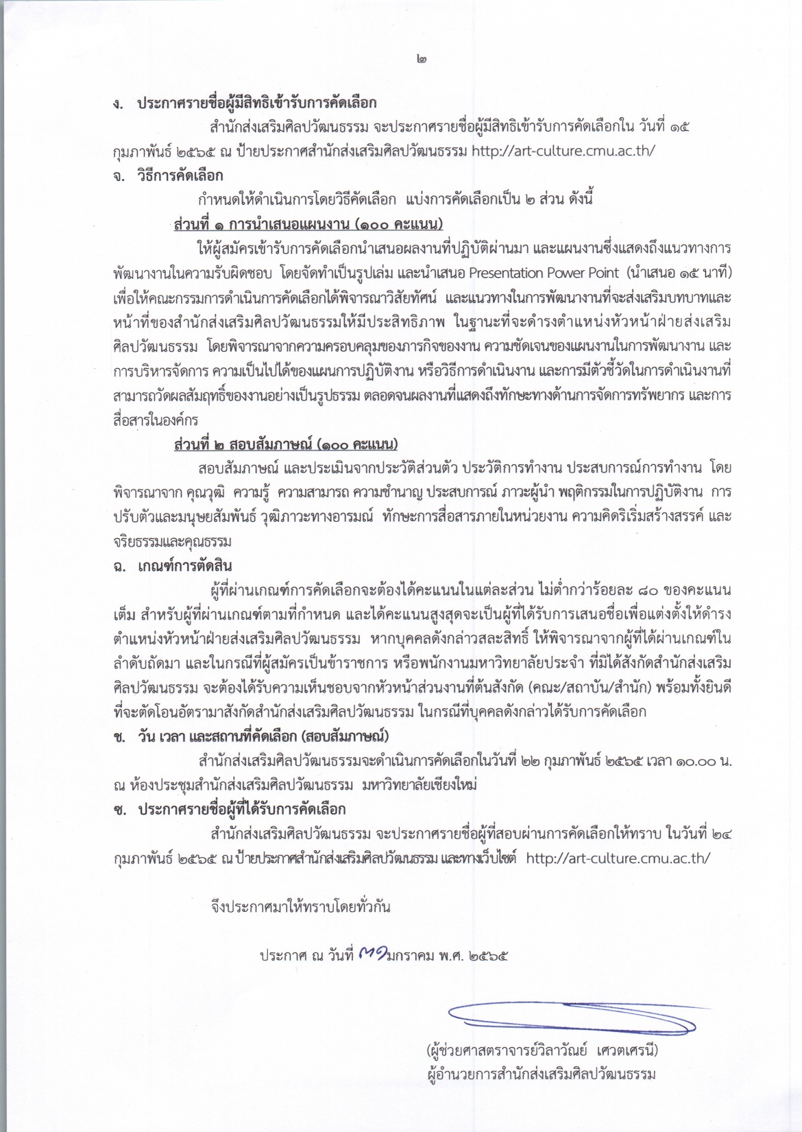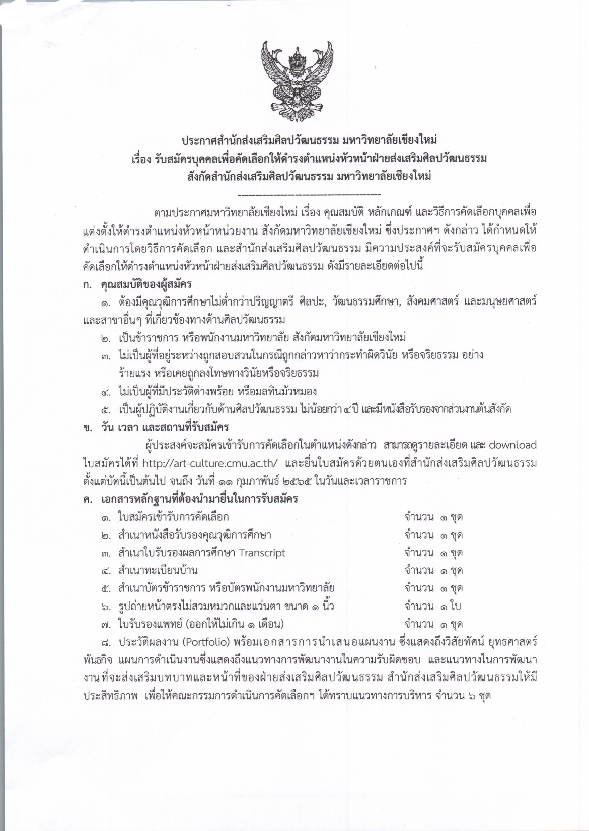สำนักส่งเสริมศิลปวัฒนธรรม มหาวิทยาลัยเชียงใหม่ ประกาศรับสมัครบุคคลเพื่อคัดเลือกให้ดำรงตำแหน่งหัวหน้าฝ่ายส่งเสริมศิลปวัฒนธรรม สังกัดสำนักส่งเสริมศิลปวัฒนธรรม มหาวิทยาลัยเชียงใหม่ โดยผู้สนใจสามารถดูรายละเอียดและดาวน์โหลดใบสมัครได้ตามไฟล์แนบด้านล่างนี้ และยื่นใบสมัครด้วยตนเองได้ตั้งแต่บัดนี้ ไปจนถึง วันที่ 11 กุมภาพันธ์ 2565 ในวันและเวลาราชการ สอบถามรายละเอียดเพิ่มเติม โทร. 053 943 624